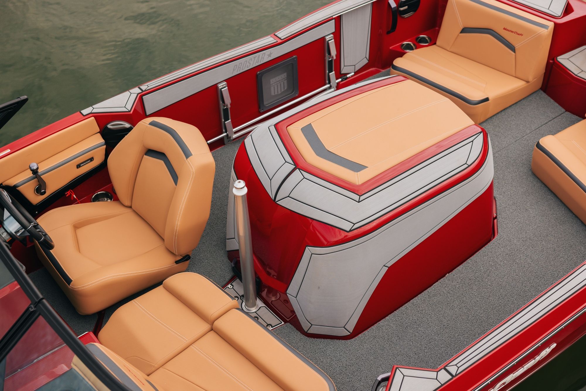 FLATTEST WAKESThe ProStar continues to live up to its reputation for the industry’s flattest wakes at any line length and any speed with the most minimal amount of spray. Thanks to a perfected hull and proprietary hull-rails, the ProStar puts out the best behind-the-boat experience for skiers of all ages, abilities, and disciplines. | SUPERIOR HANDLINGThe ProStar is the industry’s only waterski boat with four fins for even better tracking, even better control, and an even better driving experience. Paired with the new hull rails and a sleek yet sophisticated helm featuring a 10” touchscreen, the ProStar offers the best ski boat driving experience on the water. | BEST FIT-AND-FINISHAll MasterCraft boats are handcrafted by experts using the highest quality parts, materials, and vendors. This makes our boats durable, reliable, and ready to rip. In addition to being the most reliable boats, we also make the most comfortable boats. Each seat is ergonomically designed and features triple-density foam and premium vinyl for the most comfortable day on the water for your crew. |
