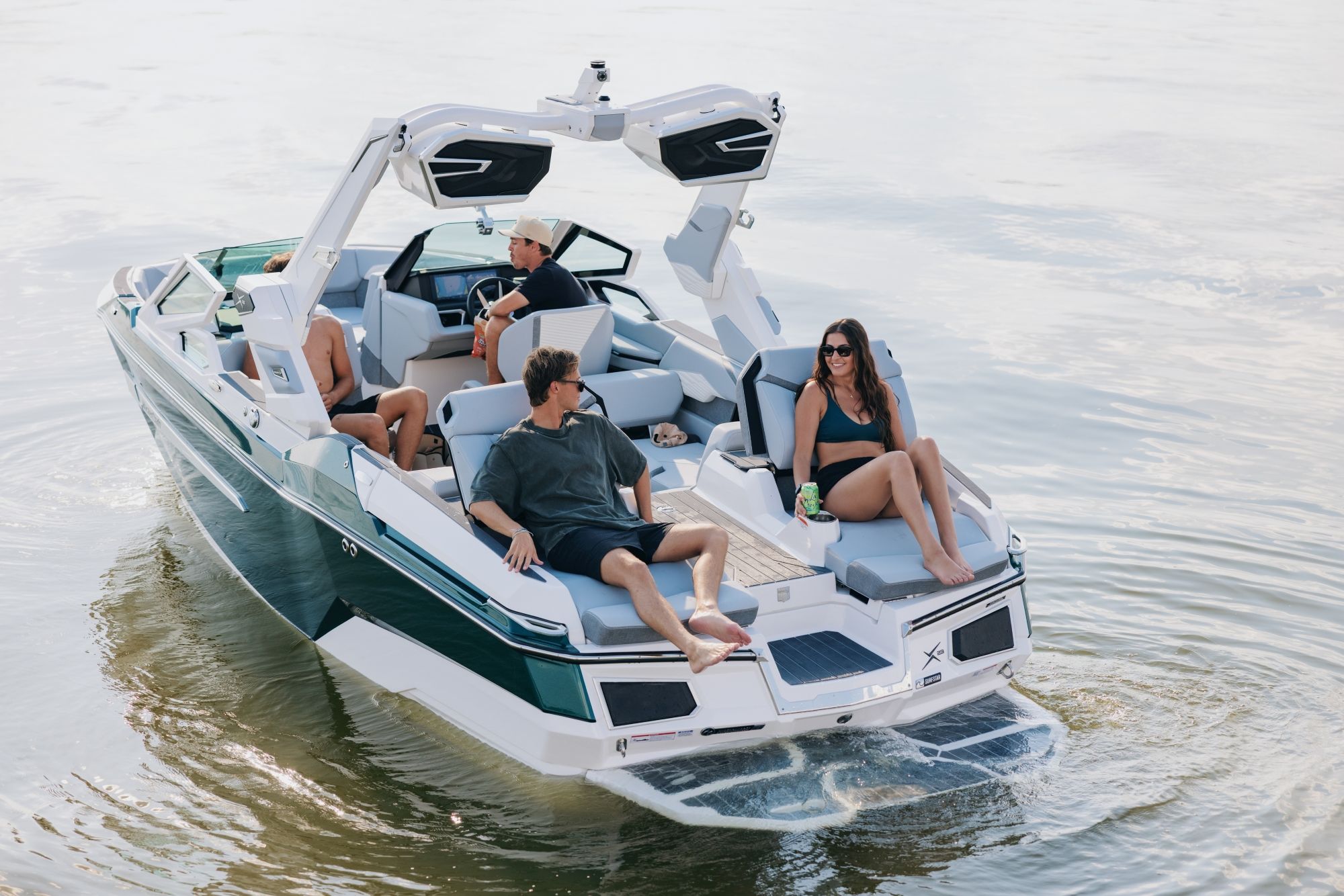 ICONIC TRANSOM, TRANSFORMEDThe original X23 introduced a feature that quickly became one of the most loved spaces on the boat: the transom loungers. What started as a thoughtful design decision ended up shaping how crews spend their day. | THE GOLD STANDARDThe X23 originally became known for what happened behind the boat—and that standard hasn’t changed. An evolved running surface works in harmony with SurfStar and substantial ballast to deliver powerful, customizable wakes and waves that riders trust from the first pull. | |